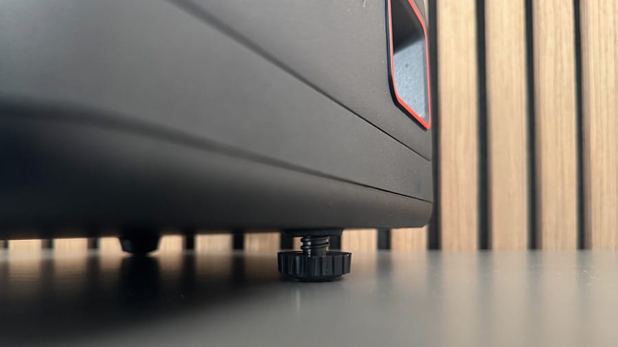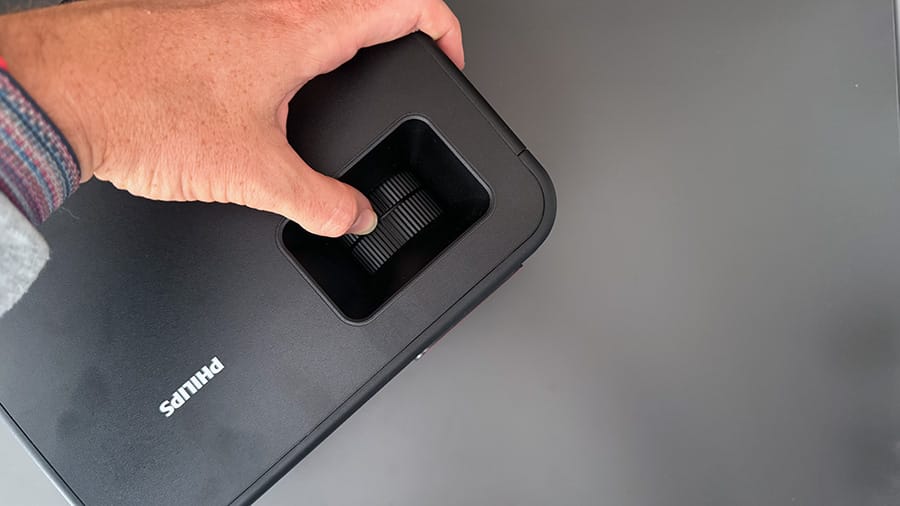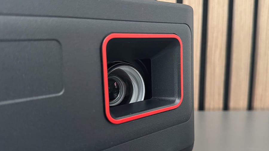 The Philips GamePix 900 construction is entirely plastic and while that’s not uncommon for projectors, it doesn’t feel absolutely premium as a result. It’s a solid unit though and I found no creakiness or loose panelling. The textured matte black shell is an absolute fingerprint magnet however so you’ll want to have a cloth handy, but outside that I have no major complaints. Would I have liked a little metal shell to amp up the premium vibes? Sure. But I’m not going to mark it down for just rocking a plastic outfit. The small amount of red trim around the GamePix 900’s lens window on the front face is a nice nod to its gaming intentions and it’s great to see the lens tucked away inside the main body and out of harm’s way.